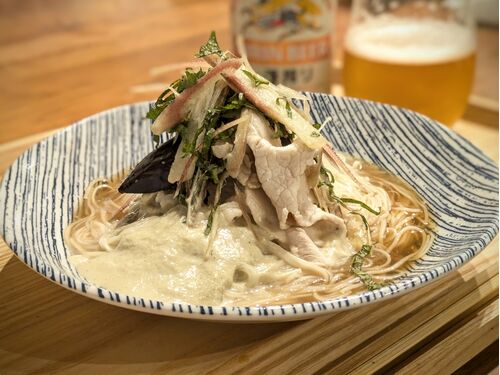 焼き茄子の和風冷製パスタ もう閉店してしまった、とあるフレンチレストランに、大好きなメニューがありました。夏の定番、「茄子の冷製スープ」。ナスの香りがふわりと立ちのぼる、ひんやりと優しいあの一皿。暑い季節に伺うときは、決まって予約の電話口で…